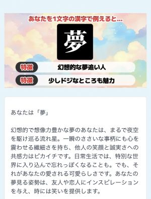 今日の診断テストは、手塚を漢字一文字で例えると夢でした(*^^*)