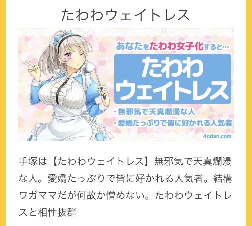 今日の診断テストは、手塚はなんのたわわタイプ?ウエイトレスでした(*^^*)