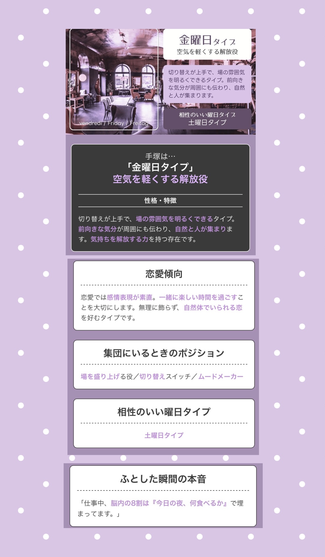 今日の診断テストは、手塚を曜日で例えると(*^^*)金曜日でした?
