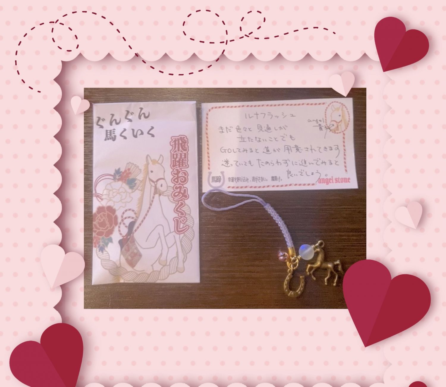 書店でお馬さんの縁起が良さそうなおみくじを見つけ買ったら、このストラップとメッセージが(*^^*)?