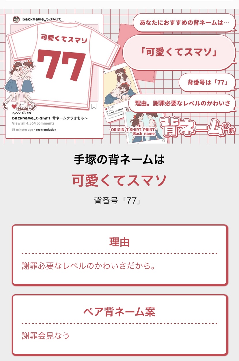 今日の診断テストは、手塚の背ネーム 77番 可愛くてスマン(*^^*)