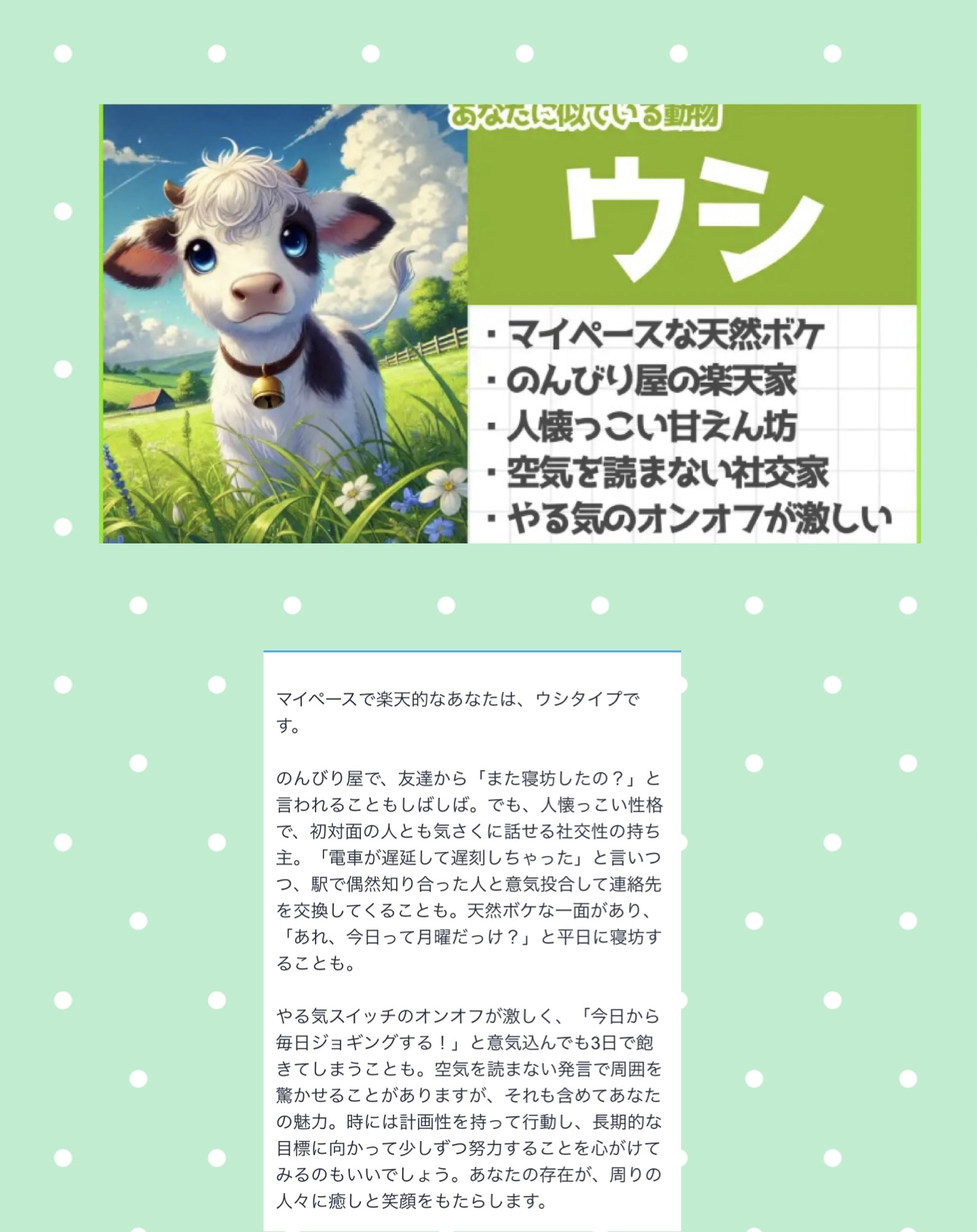 手塚を動物に例えると、牛になりました(*^^*)当たってるかも(笑)