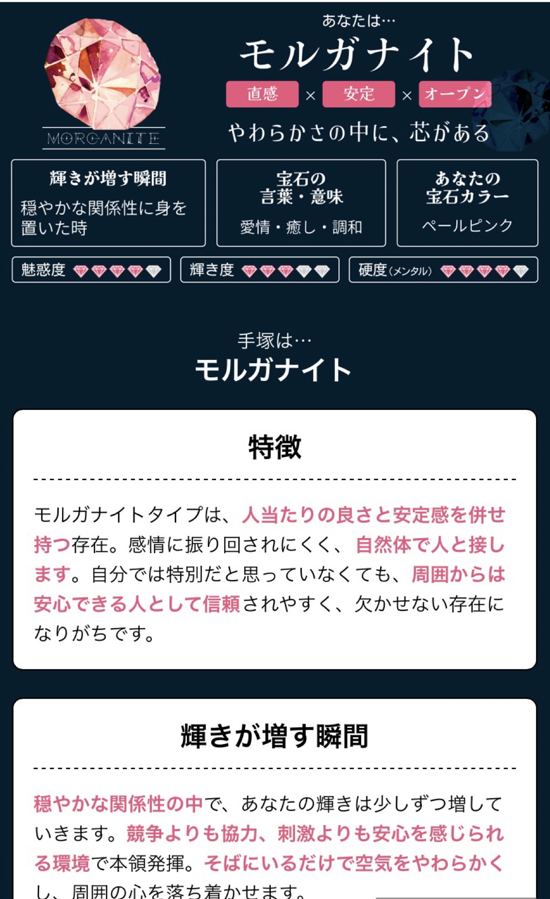 今日の診断テストは、手塚の宝石タイプ(*^^*)ピンク色のモルガナイトになりました